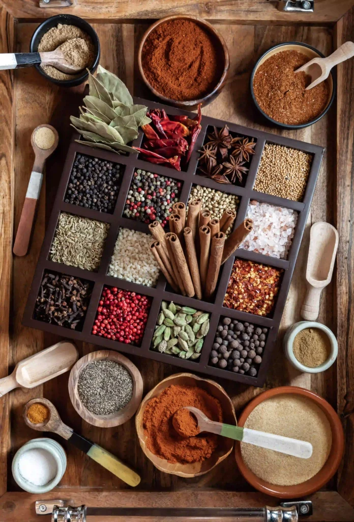 Cumin, coriander, fennel, cardamom, cloves, pepper, bay leaves, and other whole spices.